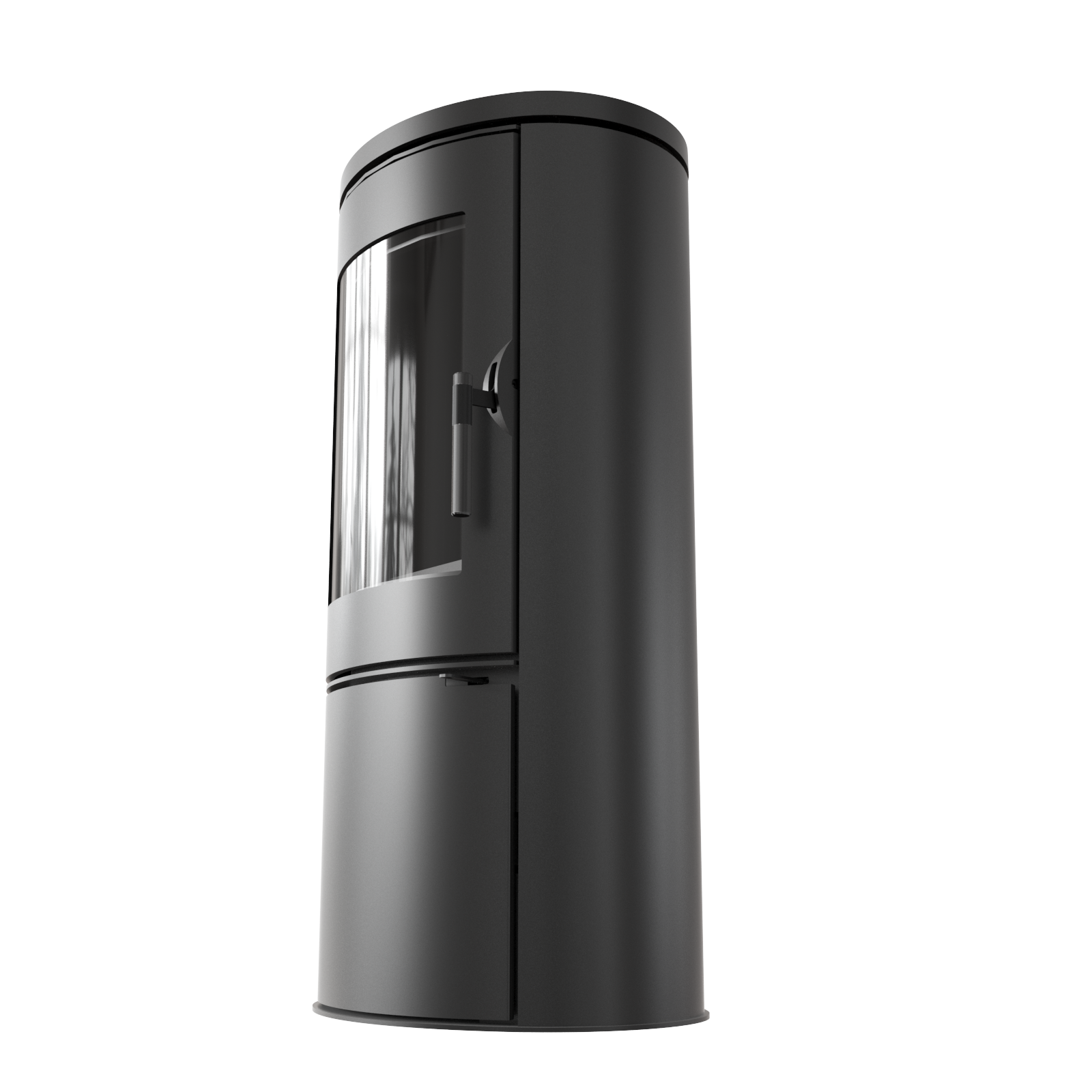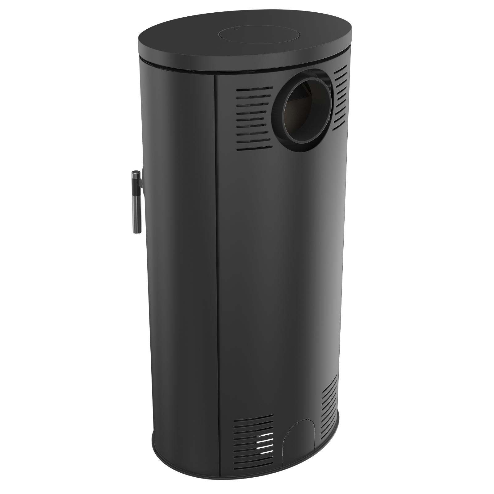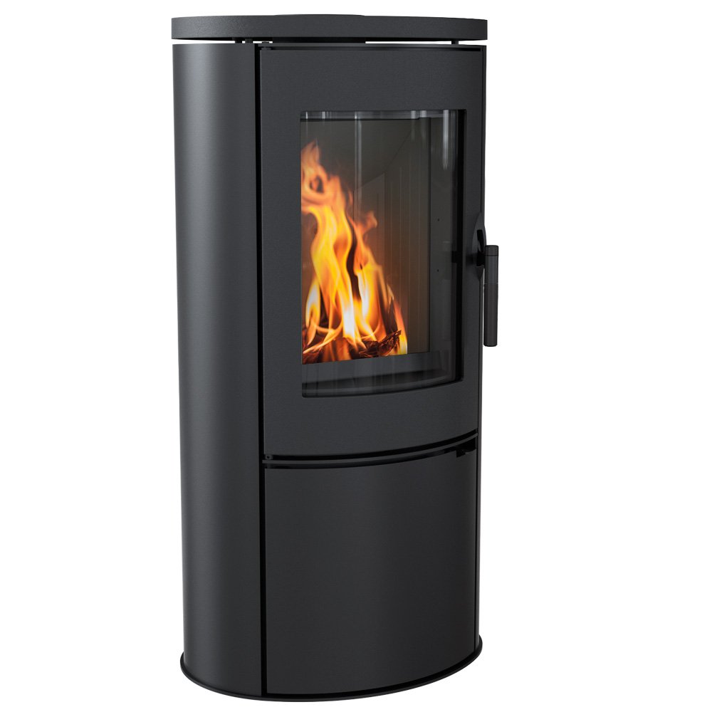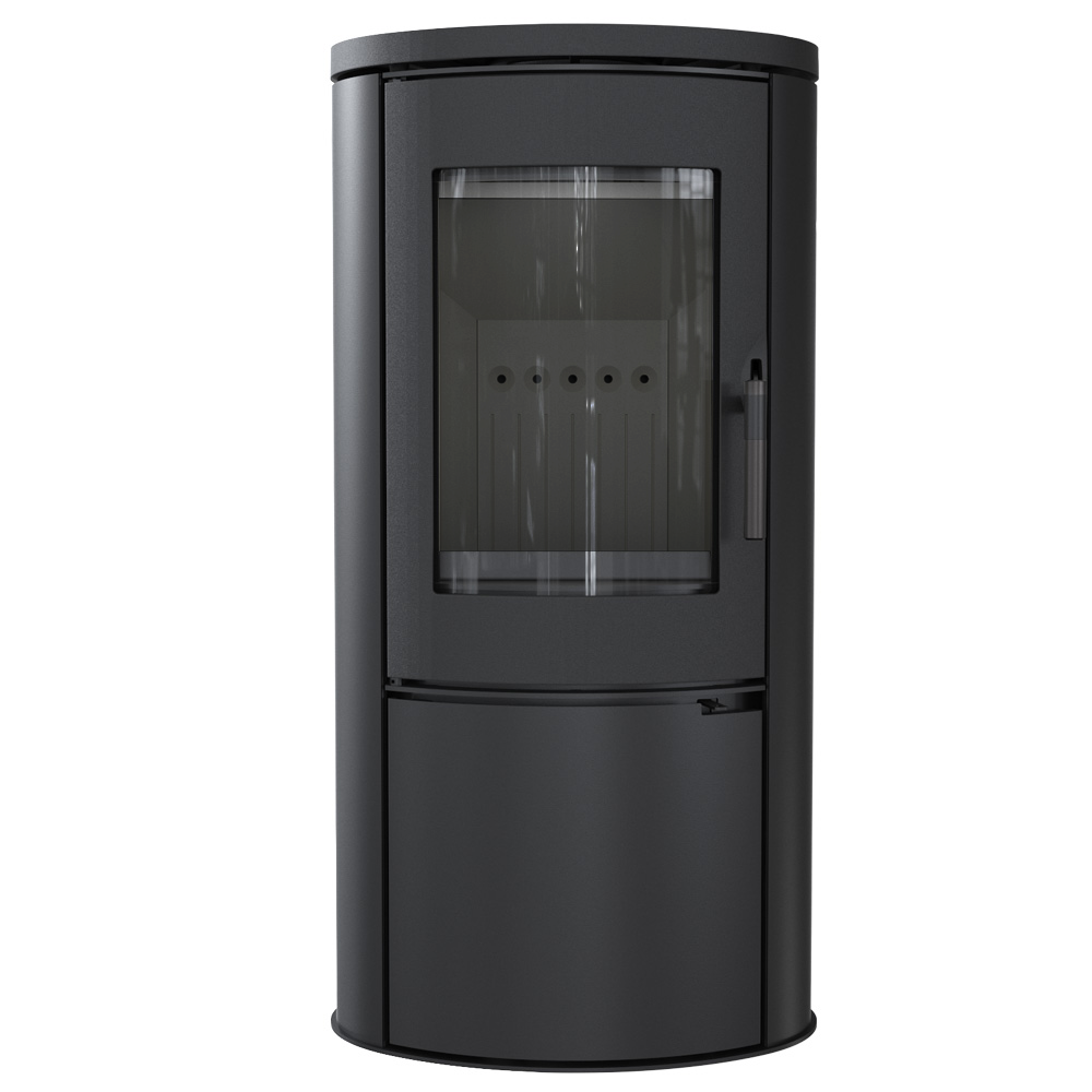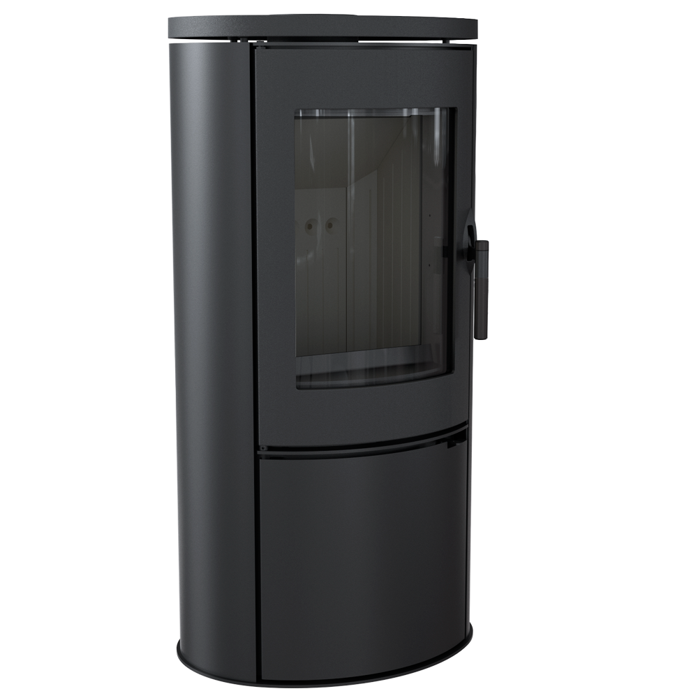kompakter, kraftvoller Kaminofen in ovaler Form, mit geringer Höhe